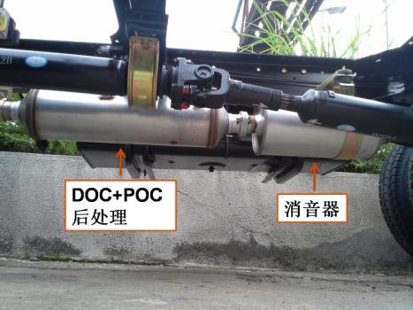 四、找DOC+POC后处理系统。这是最容易辨识的标志,只需要蹲下来从车底看排气管上是否有两个柱形罐状装置。国III车只有一个,即消音器;而国IV车则有两个,其一为消音器,另一为DOC+POC后处理系统。