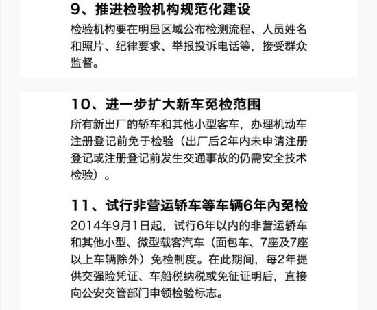 新政对我们消费者影响最大的简单点说其实就三条 1.符合新规的私家车6年内免检。2.未来可异地检车。3.简化检车流程,周六日开放检车减少等待时间,服务人员的工作意识或许能提高不少。