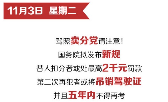 11月2日,《中华人民共和国道路交通安全法修正案(送审稿)》在国务院法制办官网公开一个月征求意见。记者了解到,“送审稿”中新增规定,代替实际驾驶人接受机动车交通违法处罚和记分并从中牟取经济利益的,处暂扣6个月机动车驾驶证,并处1000元以上2000元以下罚款。