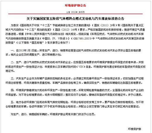 2012年12月3日,环保部发布《关于实施国家第五阶段气体燃料点燃式发动机与汽车排放标准的公告》。公告称,为严格实施国家机动车排放标准,推进环境空气质量改善进程,规定要求自2013年1月1日起,所有生产、进口、销售和注册登记的天然气发动机与汽车必须符合国五排放标准。