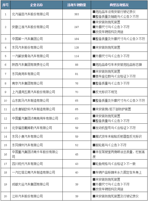 工业和信息化部已经依据《道路机动车辆生产企业及产品准入》管理有关规定,将违规车型在《公告》中予以撤销,现将违规产品数量排名前20的车辆生产企业予以通报。同时,工业和信息化部会将违规行为录入车辆生产企业信用信息管理平台,要求各有关企业进一步落实主体责任,强化车辆产品生产一致性管控,严格做到诚信自律,确保合格产品出厂,保障道路交通安全。