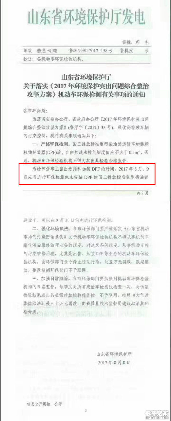 从通知中我们可以看出,山东卡友维权成功了!山东省给部分国三重型货车留出了缓冲期,8月、9月应当进行环保检测但未安装DPF的国三排放标准重型柴油营运货车,可以在9月30日前先进行环保检测。