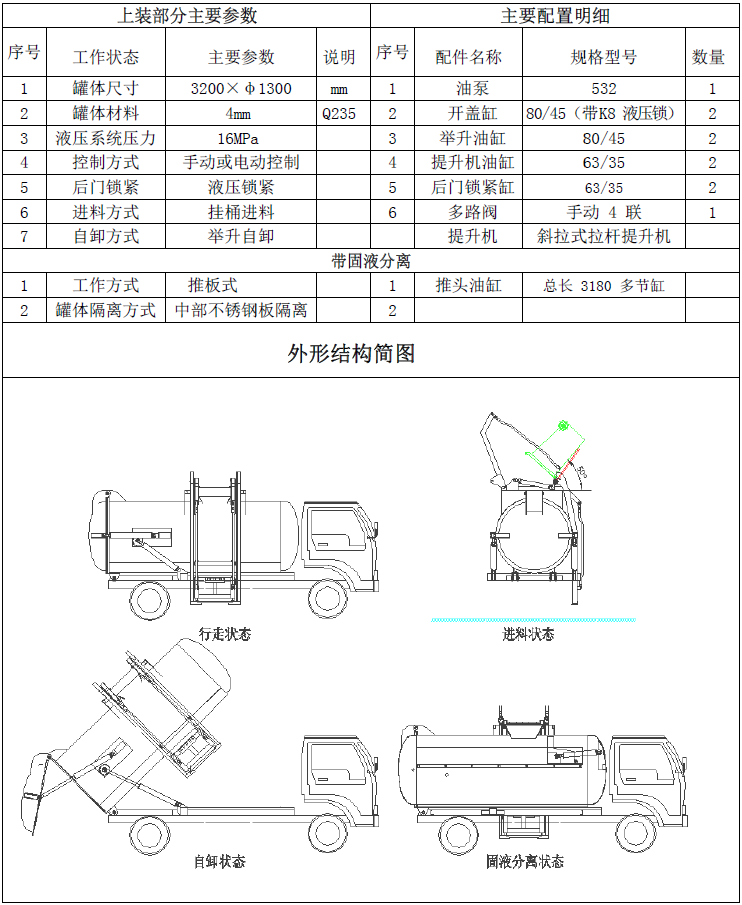 5. 驾驶室内集中电控(提升机外部手动操作),后门锁紧与后盖开关的操作设置了防误操作装置,保证了各机构动作准确、可靠。