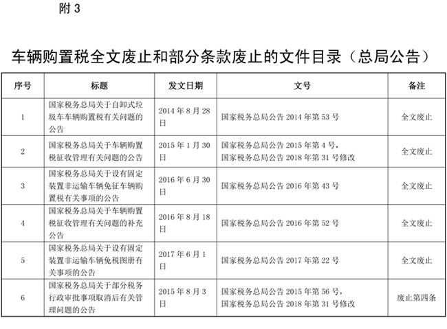 十九、本公告自2019年7月1日起施行。《车辆购置税全文废止和部分条款废止的文件目录》(见附件三)所列文件条款同时废止。