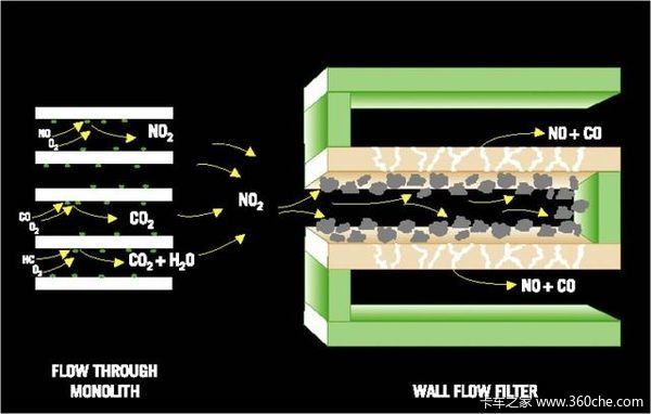 CRT和CCRT的区别在于CRT不带催化涂层的DPF,而CCRT的DPF微粒捕集器载体上涂有催化剂。在再生工作中,氧化器所产生的NO在微粒捕集器继续可以产生NO2来氧化颗粒物,使得该系统可以更加完全的去除过滤网的颗粒物。总的来说,这种再生系统安装简单,维护的工作比较少。