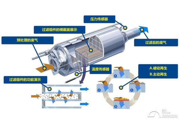 柴油机颗粒物捕集器(DPF)是一种安装在柴油发动机系统中的陶瓷过滤器,发动机的污染主要由四部分组成:微粒排放物质、碳氢化合物、氮氧化物、一氧化碳。DPF主要是针对微粒排放物质(烟灰),可以在微粒排放物质进入大气之前将其捕捉,可以减少发动机所产生的烟灰达90%以上。
