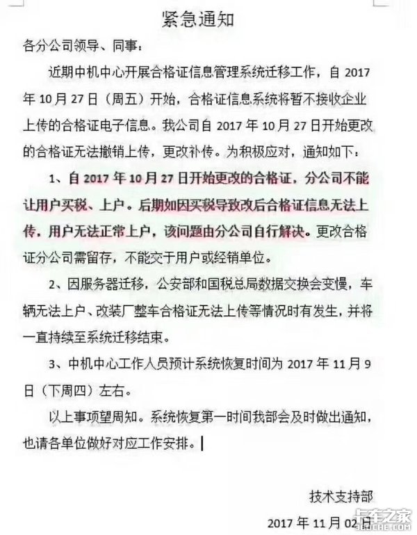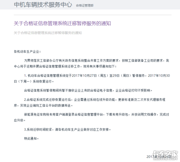10月25日国家车辆合格证管理机构-中机中心发布通知系统升级。预计在11月9日完成系统升级,此期间车辆无法上户、改装厂整车合格证无法上传等情况会时有发生。