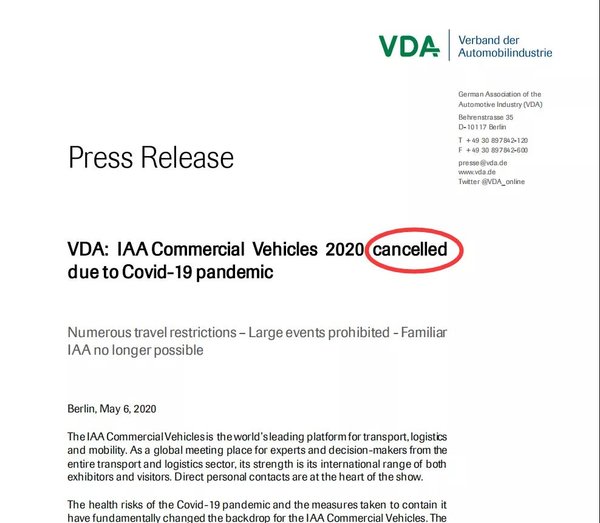 因此,德国汽车工业协会表示要取消2020年汉诺威商用车展。我们都知道,汉诺威商用车展2年才举办一次,这次取消以后,下一次大家要等到2022年才能参加该展会。